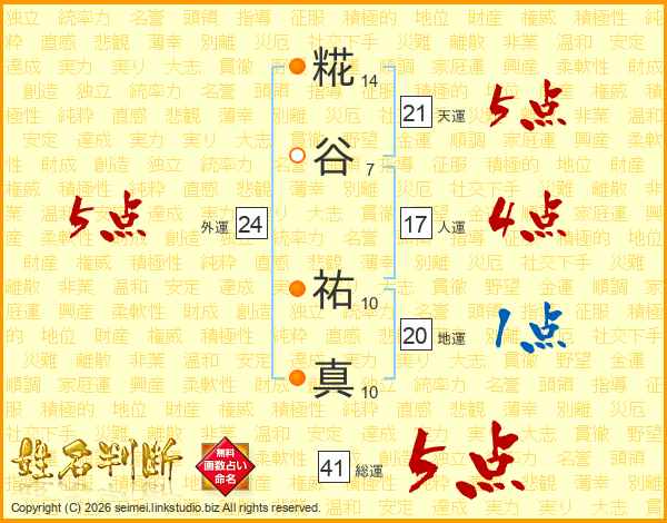 糀(14画)谷(7画) 祐(10画)真(10画)