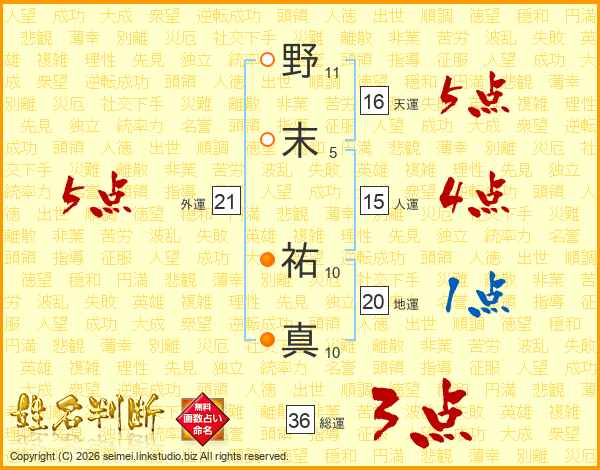 野(11画)末(5画) 祐(10画)真(10画)