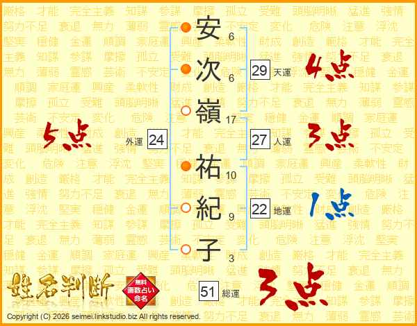 安(6画)次(6画)嶺(17画) 祐(10画)紀(9画)子(3画)