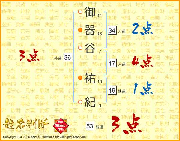 御(11画)器(16画)谷(7画) 祐(10画)紀(9画)
