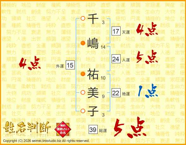 千嶋祐美子さんの総運は39画の5点!