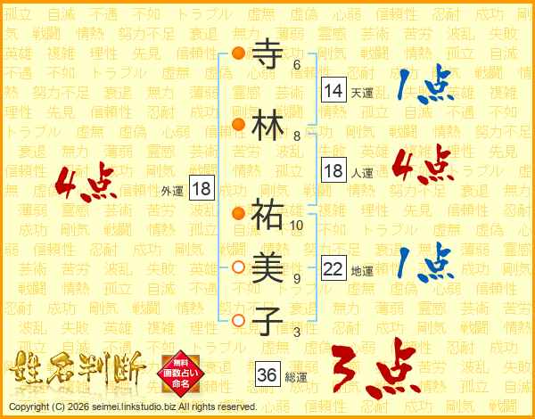 寺(6画)林(8画) 祐(10画)美(9画)子(3画)