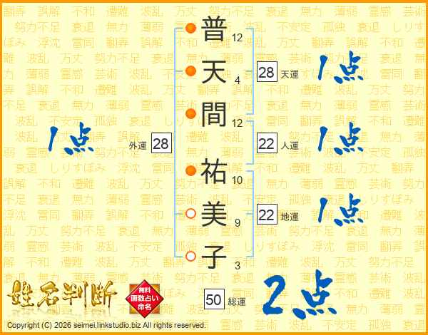 普(12画)天(4画)間(12画) 祐(10画)美(9画)子(3画)