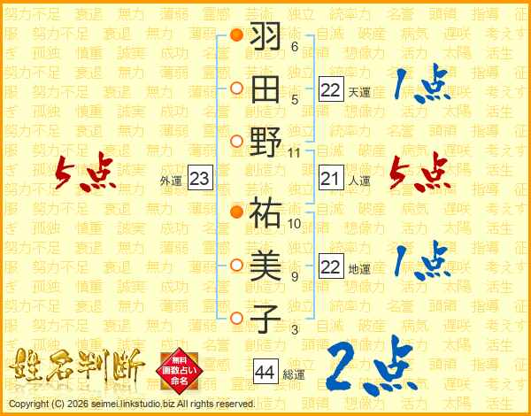 羽(6画)田(5画)野(11画) 祐(10画)美(9画)子(3画)