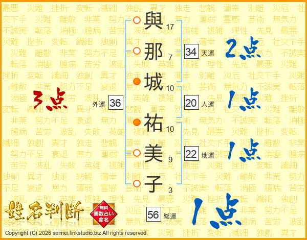 與(17画)那(7画)城(10画) 祐(10画)美(9画)子(3画)