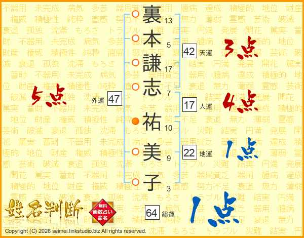 裏(13画)本(5画)謙(17画)志(7画) 祐(10画)美(9画)子(3画)