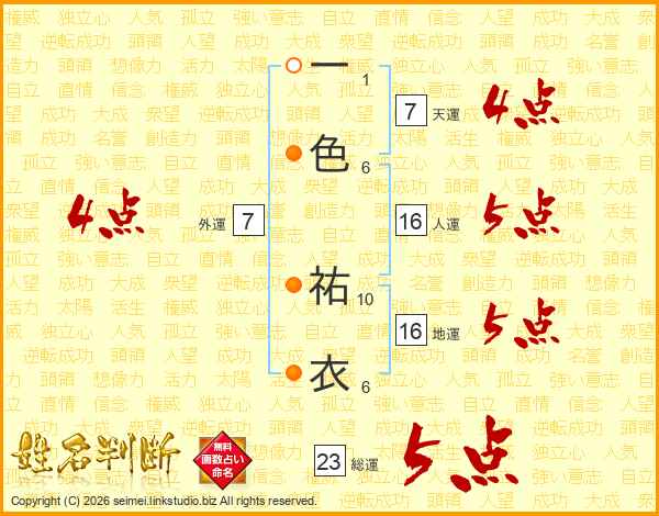 あなたの人生を表す1番重要な運勢です。生涯を通じて影響する総合運となり、主に50歳以降の晩年期に影響を及ぼします。苗字と名前の合計画数。