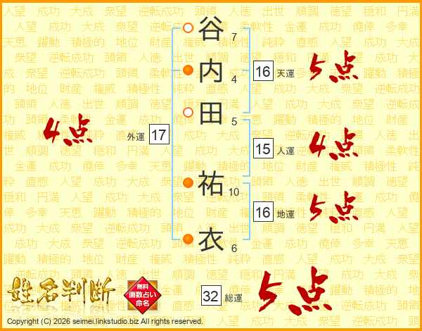 谷(7画)内(4画)田(5画) 祐(10画)衣(6画)