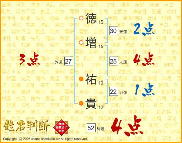 徳(15画)増(15画) 祐(10画)貴(12画)