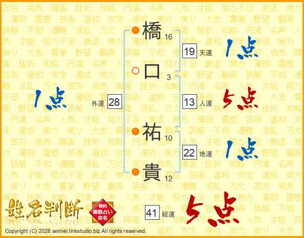 橋(16画)口(3画) 祐(10画)貴(12画)