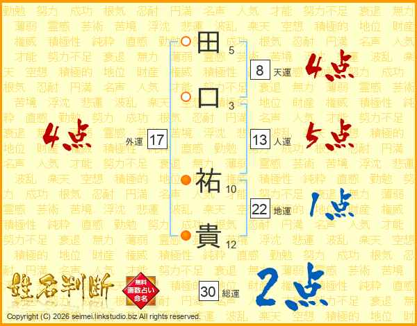 田(5画)口(3画) 祐(10画)貴(12画)
