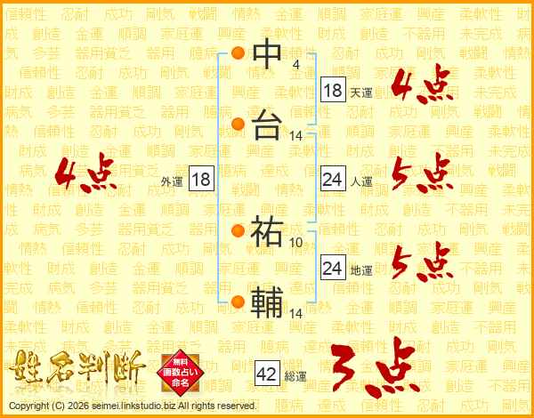 あなたの人生を表す1番重要な運勢です。生涯を通じて影響する総合運となり、主に50歳以降の晩年期に影響を及ぼします。苗字と名前の合計画数。