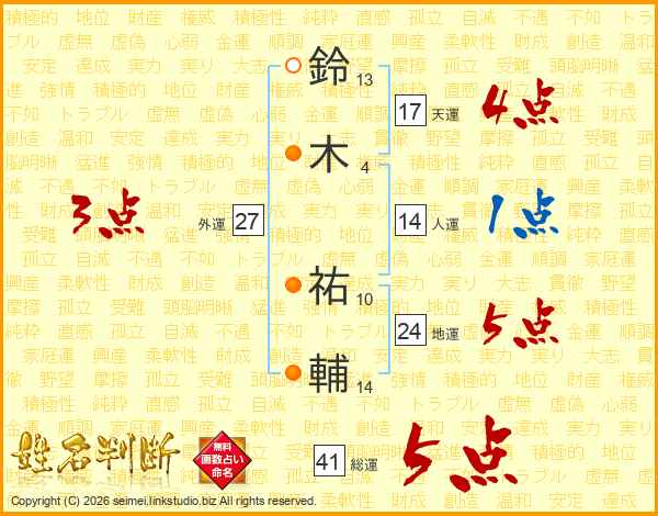 鈴(13画)木(4画) 祐(10画)輔(14画)