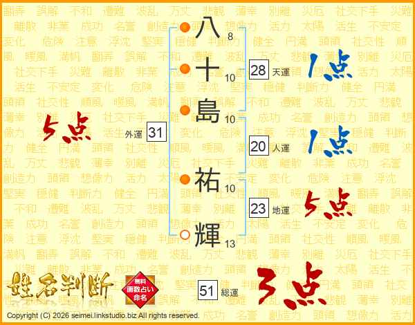 八(8画)十(10画)島(10画) 祐(10画)輝(13画)