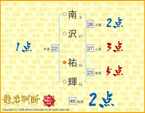 南(9画)沢(17画) 祐(10画)輝(13画)