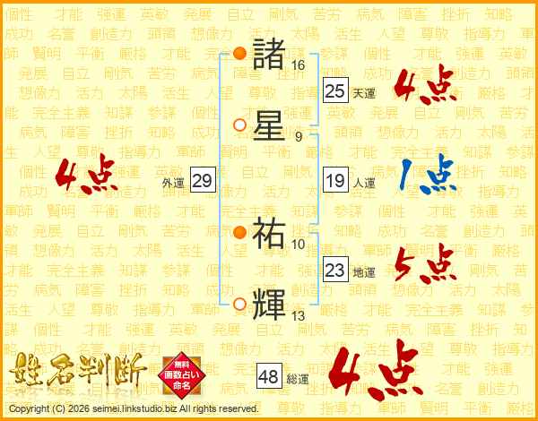 諸(16画)星(9画) 祐(10画)輝(13画)