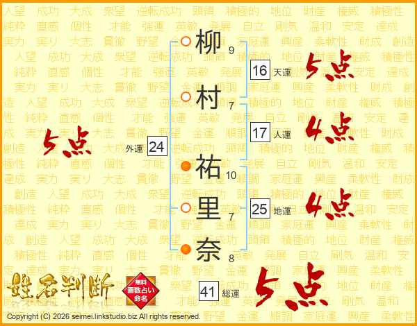 柳(9画)村(7画) 祐(10画)里(7画)奈(8画)