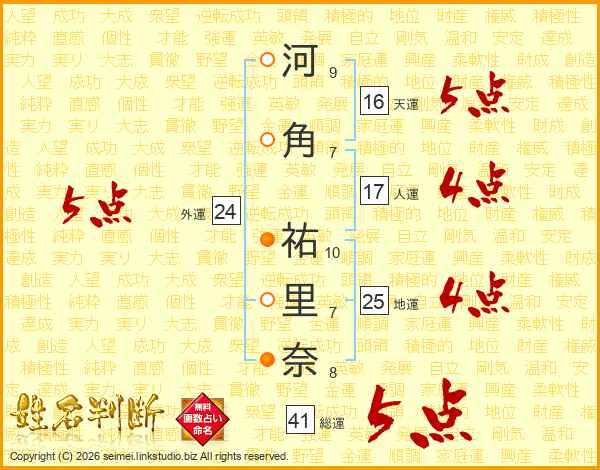 河(9画)角(7画) 祐(10画)里(7画)奈(8画)
