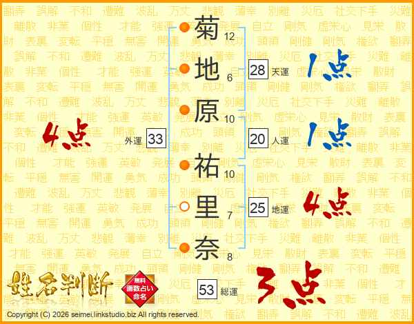 菊(12画)地(6画)原(10画) 祐(10画)里(7画)奈(8画)