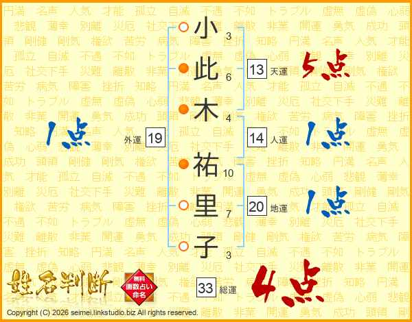 小(3画)此(6画)木(4画) 祐(10画)里(7画)子(3画)