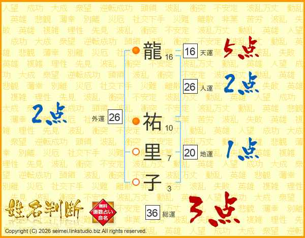 龍(16画) 祐(10画)里(7画)子(3画)