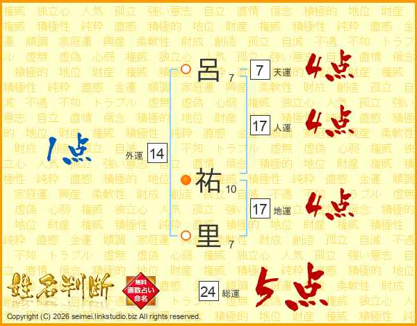 呂(7画) 祐(10画)里(7画)