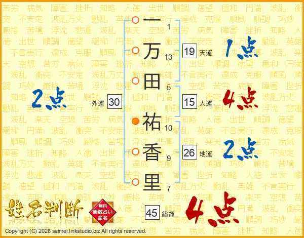 一(1画)万(13画)田(5画) 祐(10画)香(9画)里(7画)