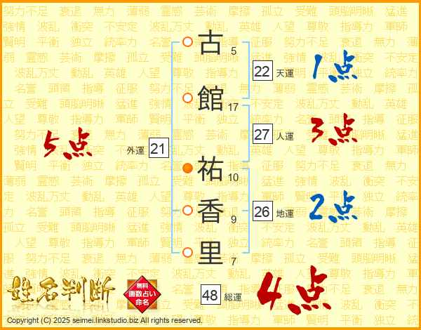 古(5画)館(17画) 祐(10画)香(9画)里(7画)