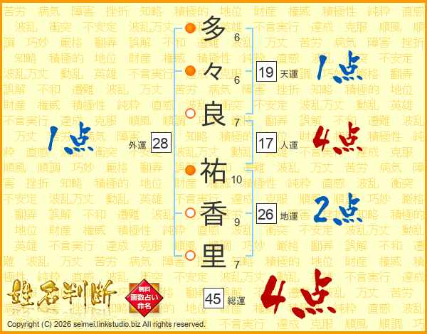 多(6画)々(6画)良(7画) 祐(10画)香(9画)里(7画)