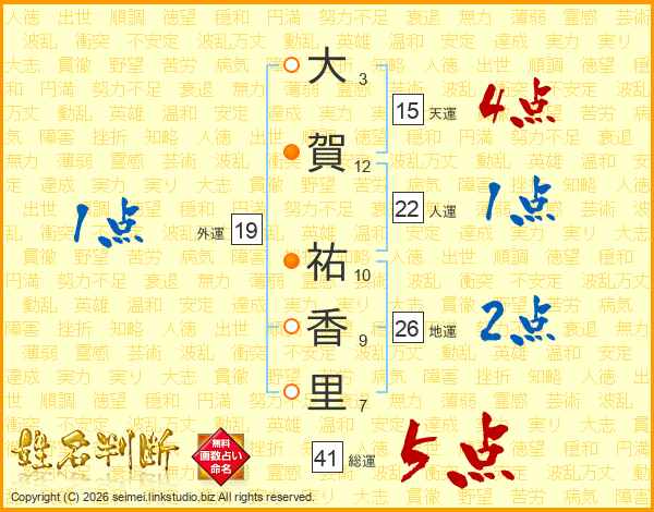 大(3画)賀(12画) 祐(10画)香(9画)里(7画)