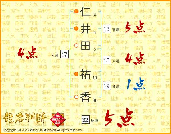 仁(4画)井(4画)田(5画) 祐(10画)香(9画)