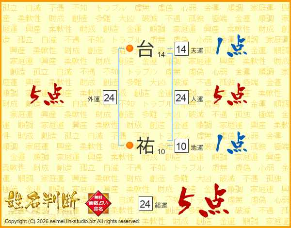 生活面を象徴する運勢です。外部から受ける影響力を表し、結婚運、家庭運や職場、環境への順応性を表します。総運から人運を引いた画数。姓や名が1文字の場合を除く。