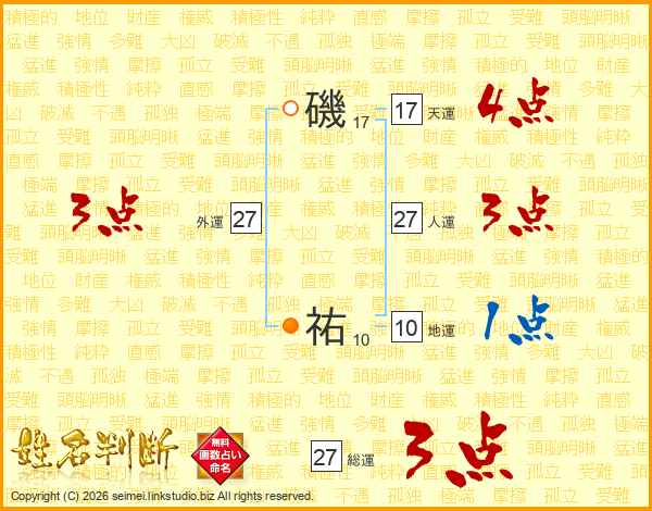 生活面を象徴する運勢です。外部から受ける影響力を表し、結婚運、家庭運や職場、環境への順応性を表します。総運から人運を引いた画数。姓や名が1文字の場合を除く。