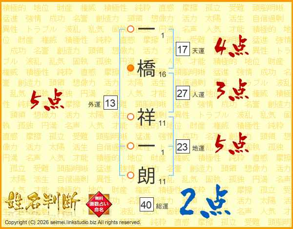 一(1画)橋(16画) 祥(11画)一(1画)朗(11画)