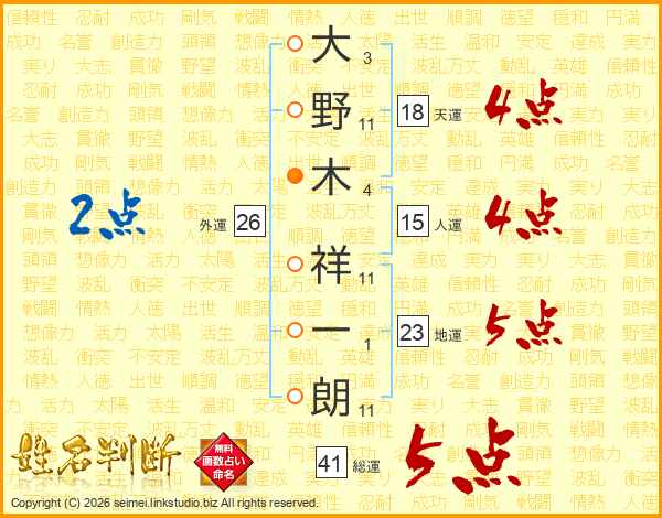 大(3画)野(11画)木(4画) 祥(11画)一(1画)朗(11画)