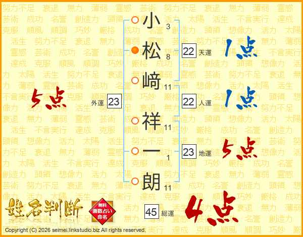 小(3画)松(8画)﨑(11画) 祥(11画)一(1画)朗(11画)