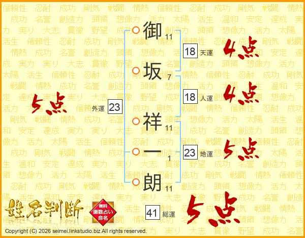 御(11画)坂(7画) 祥(11画)一(1画)朗(11画)
