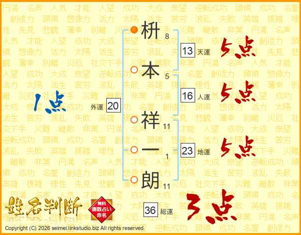 枡(8画)本(5画) 祥(11画)一(1画)朗(11画)