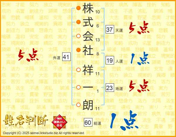 株(10画)式(6画)会(13画)社(8画) 祥(11画)一(1画)朗(11画)