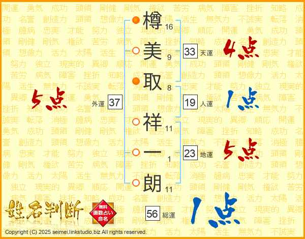 樽(16画)美(9画)取(8画) 祥(11画)一(1画)朗(11画)