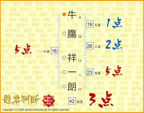 牛(4画)膓(15画) 祥(11画)一(1画)朗(11画)