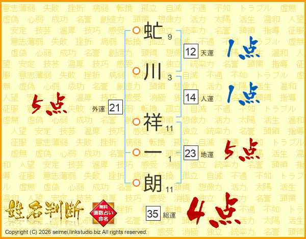 虻(9画)川(3画) 祥(11画)一(1画)朗(11画)