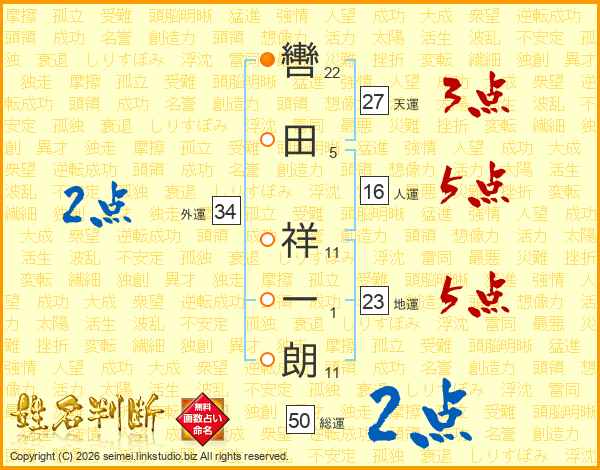 生活面を象徴する運勢です。外部から受ける影響力を表し、結婚運、家庭運や職場、環境への順応性を表します。総運から人運を引いた画数。姓や名が1文字の場合を除く。