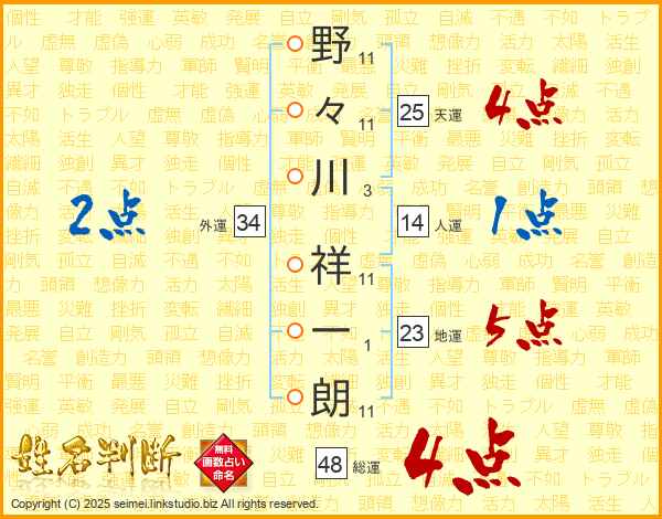 野(11画)々(11画)川(3画) 祥(11画)一(1画)朗(11画)