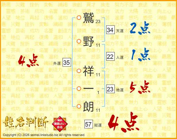 鷲(23画)野(11画) 祥(11画)一(1画)朗(11画)