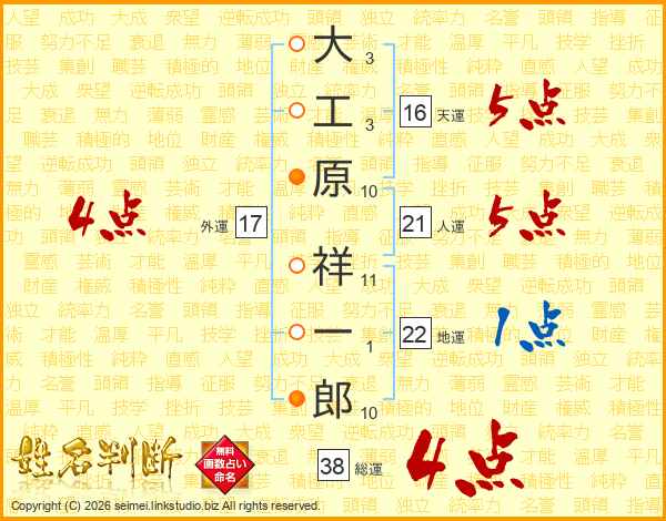 大(3画)工(3画)原(10画) 祥(11画)一(1画)郎(10画)