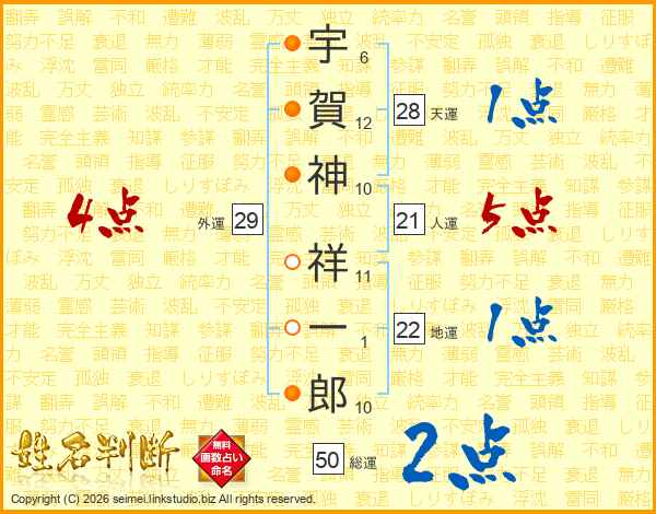 宇(6画)賀(12画)神(10画) 祥(11画)一(1画)郎(10画)