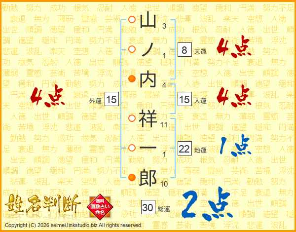 山(3画)ノ(1画)内(4画) 祥(11画)一(1画)郎(10画)