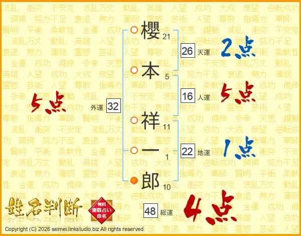 櫻(21画)本(5画) 祥(11画)一(1画)郎(10画)