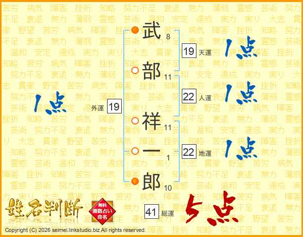武(8画)部(11画) 祥(11画)一(1画)郎(10画)